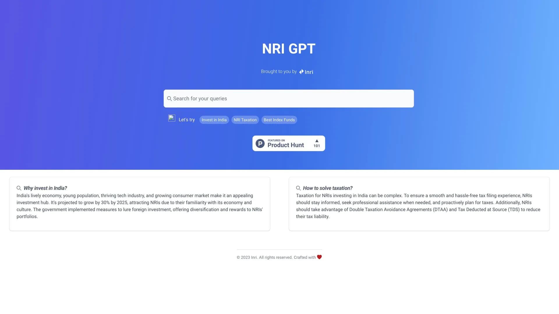 NRI GPT is your AI-powered assistant for seamless India investing and taxation guidance. Get expert answers on NRI investments, tax-saving strategies like DTAA and TDS, and market insights—all tailored to India's booming economy. Optimize your portfolio with smart, AI-driven advice today!